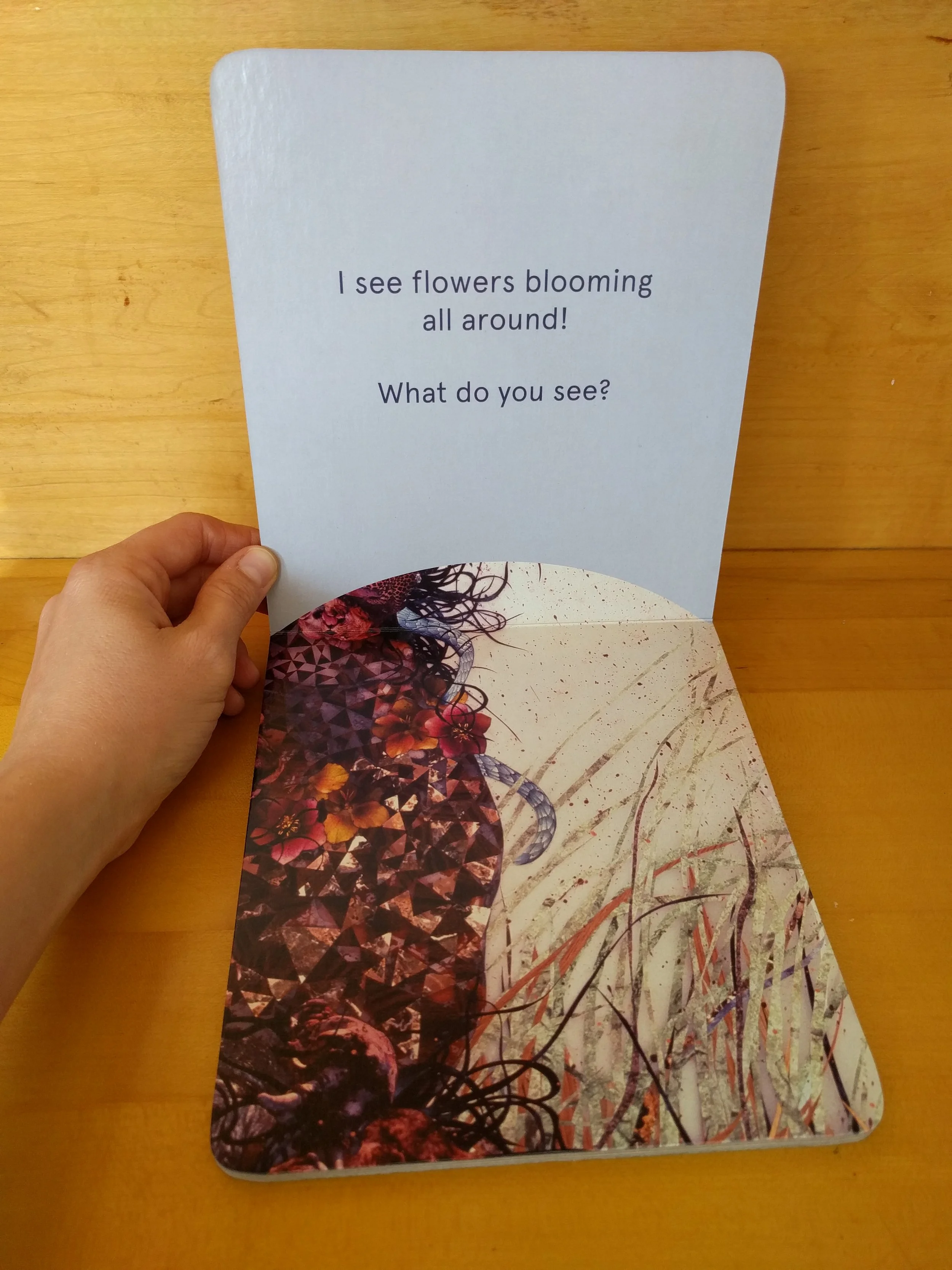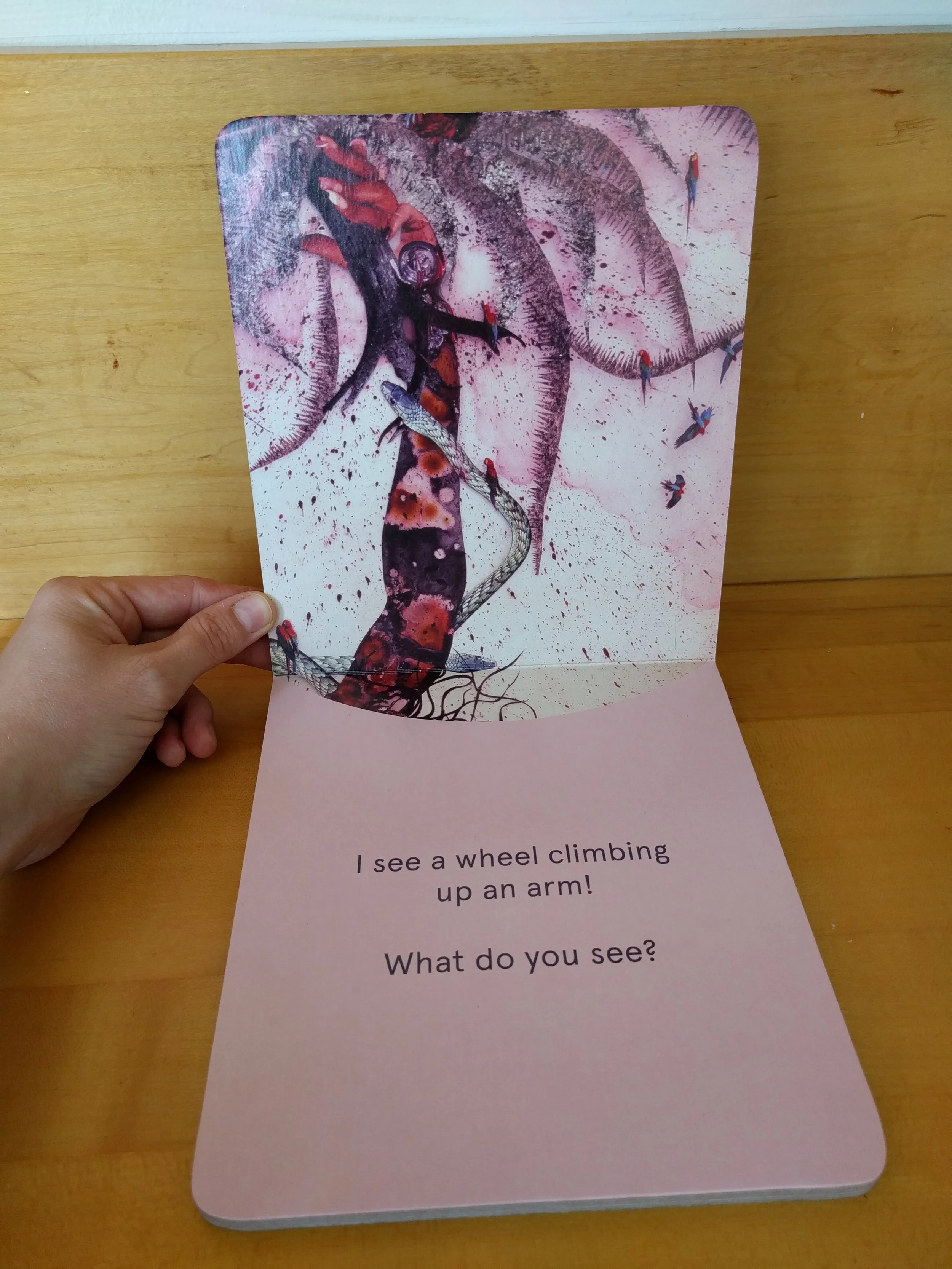 I'm delighted to share a new-to-me board book by artist Wangechi Mutu. It's called What do you see? It's a contemporary spin on search-and-find children's books. Mutu has collaged a fantastical, vibrant world where objects are not quite what they seem. The book exemplifies a child's world: curiosity is everything. This book looks different than anything else in our library, and it's a great chance to explore and introduce collage. We may even do a companion activity with this book and collage with paper, leaves, figs, and rocks we've collected over the last few days. The book is published by Home Grown Books, a Brooklyn-based published. (You know I love that.)